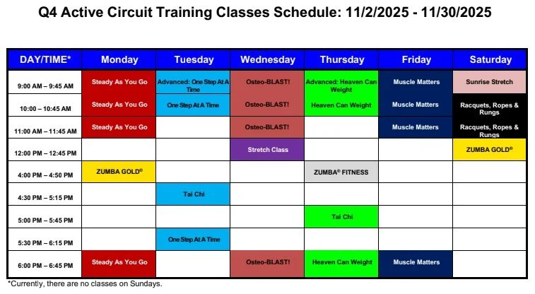 Q4 Active circuit classes are “for all levels,” and are offered Monday through Saturday (there are no classes on Sundays, at this time). Advanced-level classes are offered on Tuesdays and Thursdays, from 9:00AM to 9:45AM. For class descriptions, see further below.