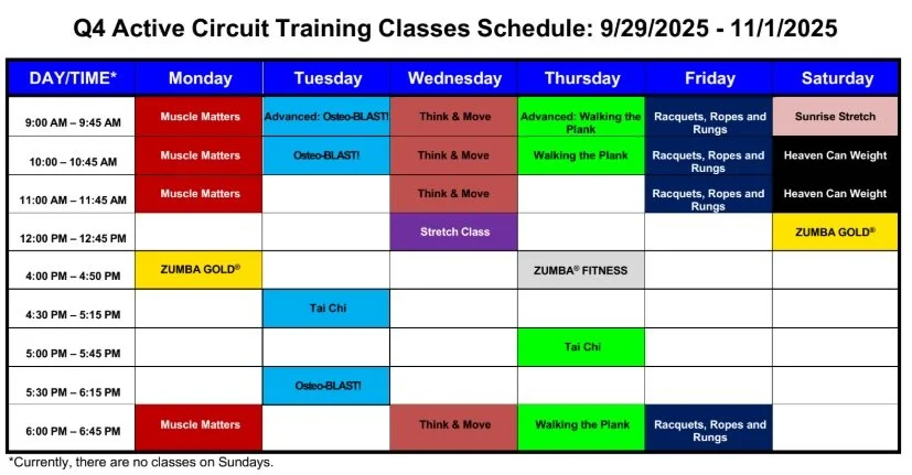Q4 Active circuit classes are “for all levels,” and are offered Monday through Saturday (there are no classes on Sundays, at this time). Advanced-level classes are offered on Tuesdays and Thursdays, from 9:00AM to 9:45AM. For class descriptions, see further below.